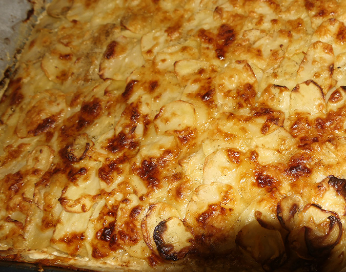 4. De vier teentjes knoflook worden geperst en bij de room gegooid en gemengd met een deel van de kaas. Dit mengsel gaat over de aardappelschijfjes. 5, Verdeel dan de kleine klontjes boter over de ovenschaal en zet de schaal dan zo’n uur in de oven. Verhoog daarna